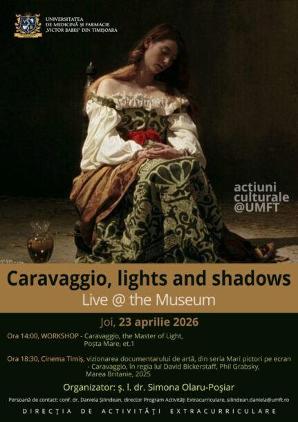 acum 3 oreUniversitatea de Medicină și Farmacie „Victor Babeș” din Timișoara vă invită, în cadrul programului acțiuni culturale UMFT, la Live@the Museum: Caravaggio, lights and shadows. Activitatea pornește de la universul vizual al maestrului luminii, Michelangelo Merisi da Caravaggio, artist care a marcat decisiv nașterea barocului. Evenimentul debutează joi, 23 aprilie 2026, […]