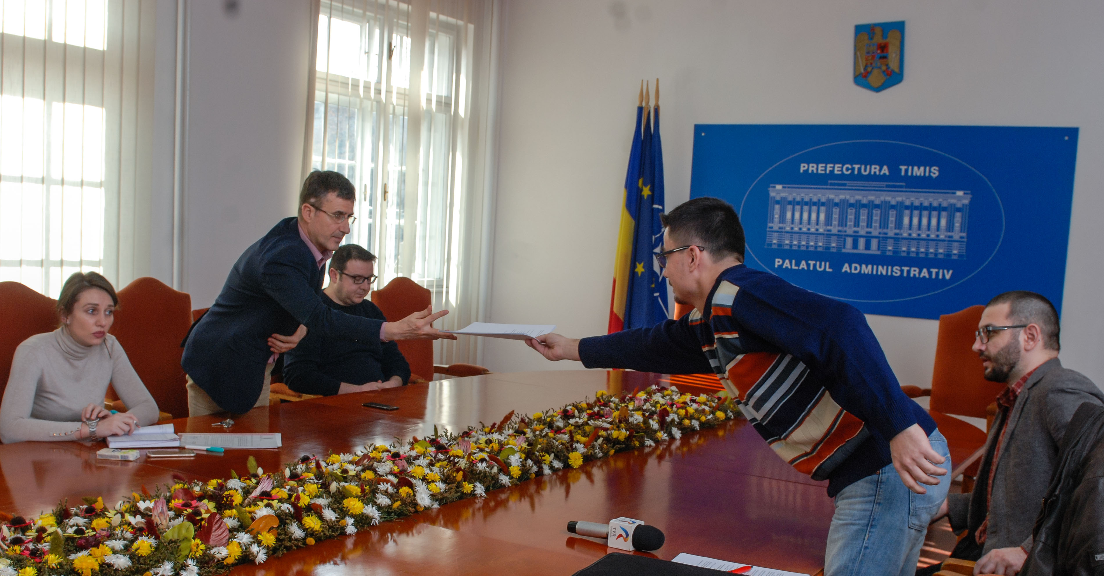 Doi reprezentanți ai protestatarilor din Piața Victoriei s-au întâlnit vineri cu prefectul de Timiș, Mircea Băcală. Aceștia i-au înmânat reprezentantului Guvernului Proclamația România 2017+ și trei cereri de demisie. Este vorba despre demisia premierului Sorin Grindeanu, a președintelui PSD, Liviu Dragnea, şi a șefului Senatului, Călin Popescu Tăriceanu.