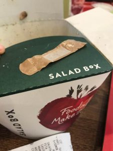 Caz revoltător la Timișoara. O femeie alături de copilul ei, în vârstă de doar 7 ani, s-au gândit să ia masa în food-court-ul din Iulius Mall, acolo unde s-au oprit la standul Salad Box. Băiatul a comandat o salată și, pe când se înfrupta mai cu poftă din mâncare, ce să vezi? Pe furculița scoasă din cutia cu mâncare, pentru o nouă înghițitură, un ditamai leucoplastul folosit, cel mai probabil căzut de pe degetul unui angajat al firmei, care nici măcar nu s-a obosit să-și scoată pansamentul din vasul în care l-a ”pierdut”.