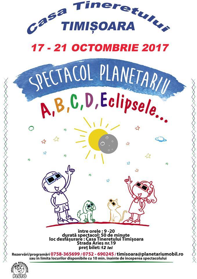 Planetariul Mobil Educațional, o inițiativă a Asociației Astronomice Pluto este un proiect educațional nonformal, menit să atragă micii vizitatori înspre lumea fascinantă a cosmosului, o temă științifică din ce în ce mai populară în rândurile publicului larg din toată lumea. Spectacolul A, B, C, D, Eclipsele este al treilea show prezentat de organizatori la Timişoara.