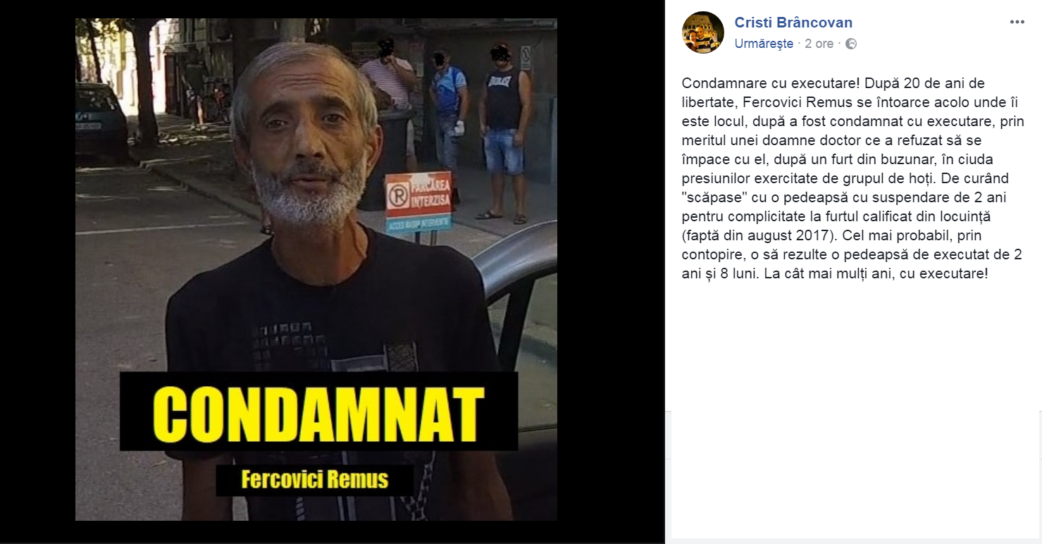”Condamnare cu executare! După 20 de ani de libertate, Fercovici Remus se întoarce acolo unde îi este locul, după a fost condamnat cu executare, prin meritul unei doamne doctor ce a refuzat să se împace cu el, după un furt din buzunar, în ciuda presiunilor exercitate de grupul de hoți. De curând «scăpase» cu o pedeapsă cu suspendare de 2 ani pentru complicitate la furtul calificat din locuință (faptă din august 2017). Cel mai probabil, prin contopire, o să rezulte o pedeapsă de executat de 2 ani și 8 luni”, a anunțat Brâncovan, prin intermediul contului său de pe o rețea de socializare.