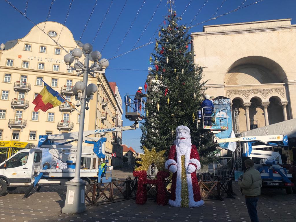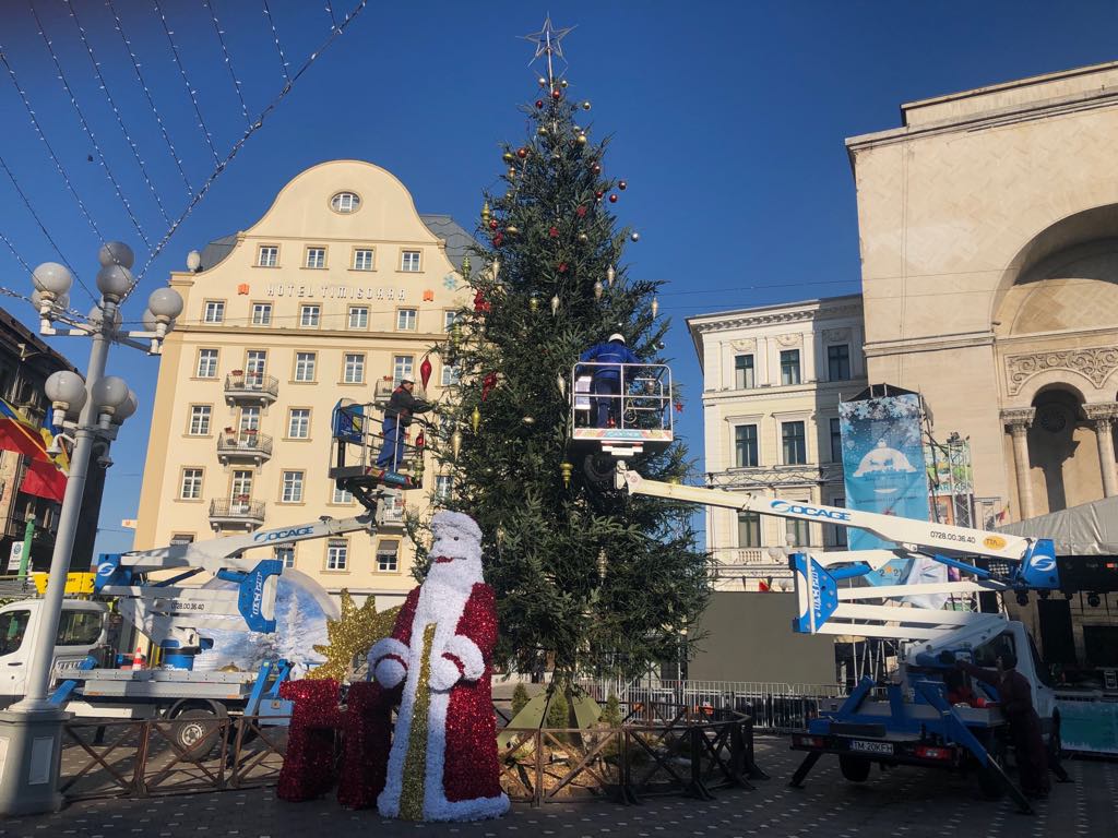 Timișoara se pregătește să intre în straie de sărbătoare, iar până la acest moment a mai rămas puțin. Pregătirile pentru deschiderea oficială a Târgului de Crăciun a fost programată pentru mâine, 1 Decembrie. Muncitorii au amplasat ieri în centrul orașului bradul de Crăciun, iar acum instalează luminițele.