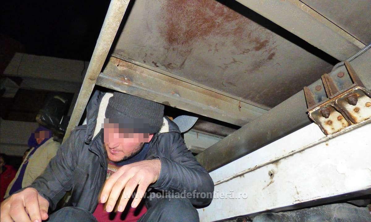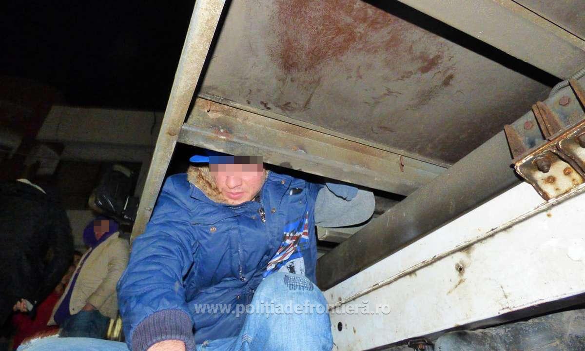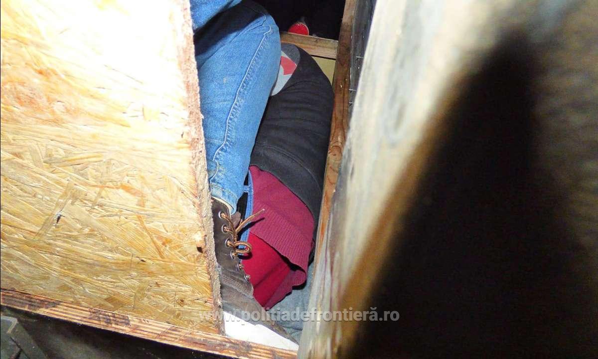 Şi în acest caz, în urma analizei de risc specifice, poliţiştii de frontieră au procedat la efectuarea controlului fizic al mijlocului de transport. Astfel, au fost descoperite ascunse, în partea din faţă a compartimentului marfă al mijlocului de transport, într-un spaţiu special amenajat,  treisprezece persoane.