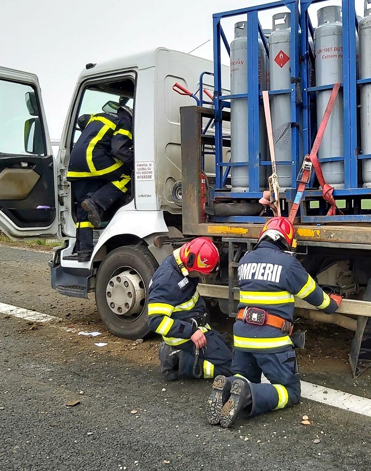 Echipajele de intervenție au executat operațiuni pentru asigurarea buteliilor care nu au căzut din camion. Autostrada a fost blocată în ambele sensuri în zona în care s-a produs accidentul.