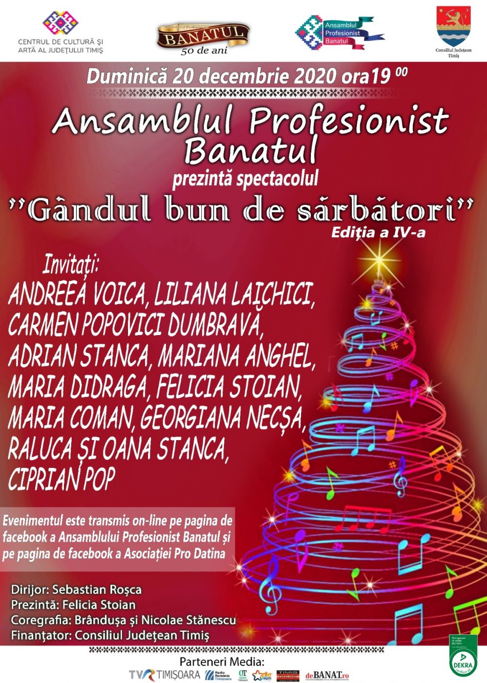 Spectacolul „Gândul bun de sărbători” va începe la ora 19 și va fi transmis în direct, pe paginile de Facebook ale Ansamblului Profesionist Banatul și Asociației ProDatina. Ca de fiecare dată, artiștii îi invită pe spectatorii virtuali să își exprime în direct gândurile și speranțele și să transmită la rândul lor urări de sărbători. Interacțiunea dintre public și artiști, deși posibilă doar în variantă online, reprezintă cea mai bună măsură a aprecierii și respectului reciproc.