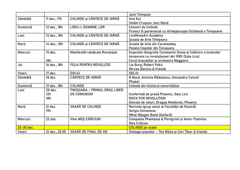 Scena, poziționată în Piața Libertății, va găzdui concerte destinate tuturor. Pentru că sărbătorile se petrec, de obicei, în familie, dar și pentru că, în vremurile grele pe care le trăim, este înțelept ca resursele locale să rămână ale comunității artistice timișorene, a fost gândit un program artistic cu și pentru timișoreni: de la mici artiști, care așteaptă cu nerăbdare momentul de a urca pe scenă, la artiști și trupe timișorene consacrate sau chiar istorice, așa cum sunt Mircea Baniciu și Phoenix.