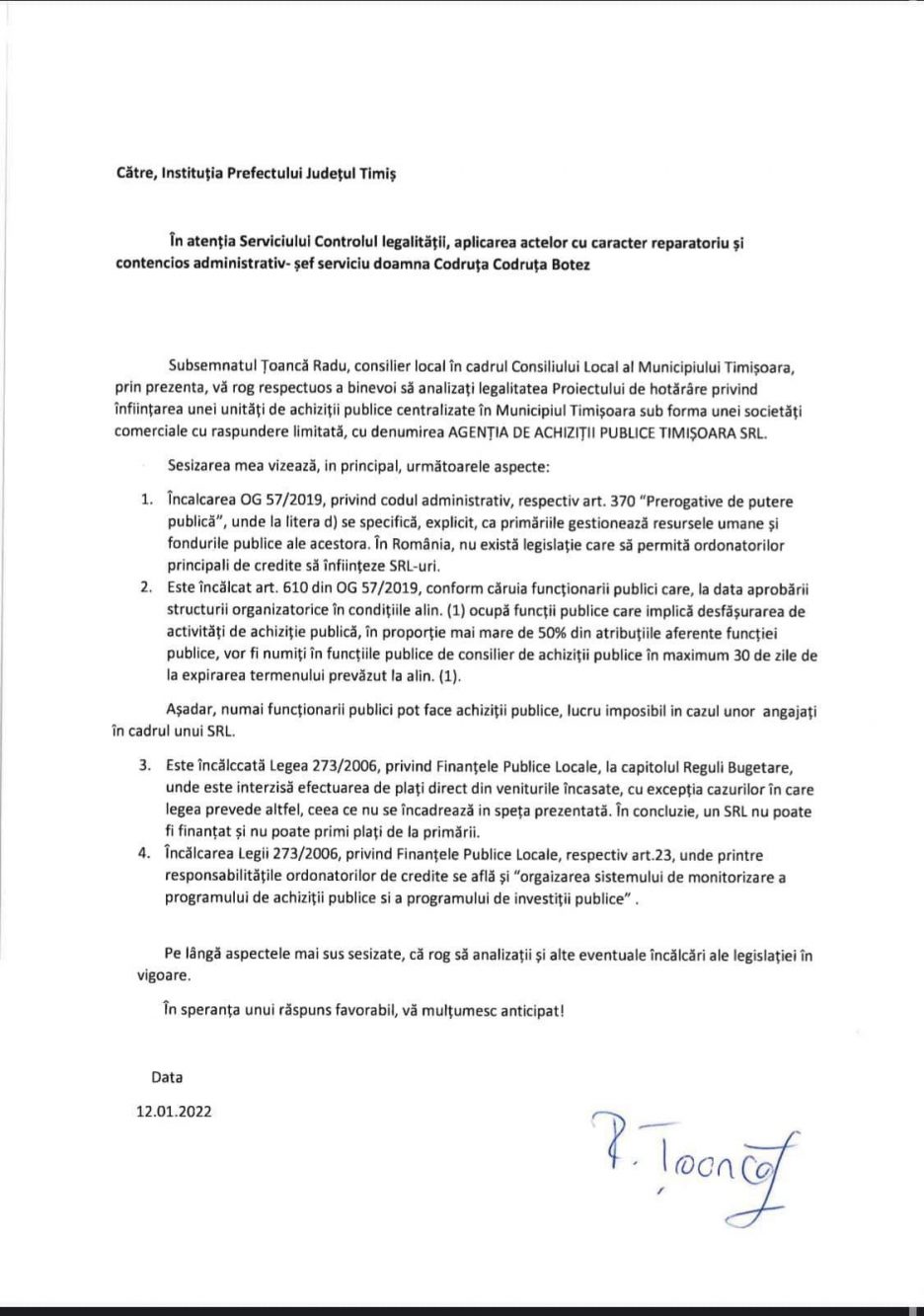 “După cum am promis în plenul ședinței de ieri, astăzi am depus la Instituția Prefectului o contestație privind înființarea UCA Timișoara. În opinia mea, acest experiment este total ilegal în condițiile legislației din România și nu reprezintă altceva decât o firmă useristă de spoliere a banului public.