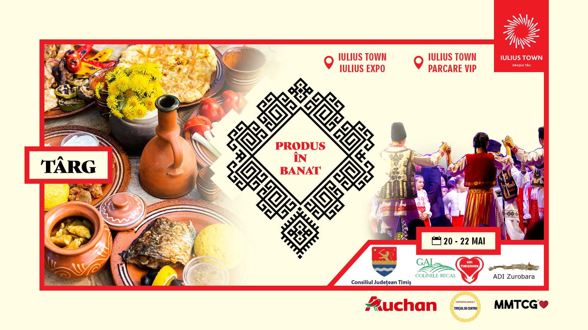 Prima ediție a Târgului „Produs în Banat”, organizat de GAL Colinele Recaș alături de Auchan, MMTCG, GAL Timișoara, ADI Zurobara și GAL Timișul de Centru, va avea loc în perioada 20-22 mai la Iulius Town Timișoara, zona Iulius Expo și parcarea VIP.