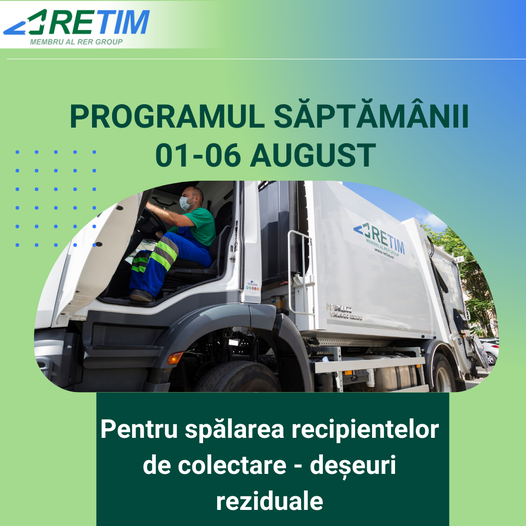 Autospecialele RETIM dotate cu sistemul de curățare și spălare a pubelelor de reziduale vor fi prezente pe străzile din zona 1 TIMIȘOARA și zona 0 LUGOJ.