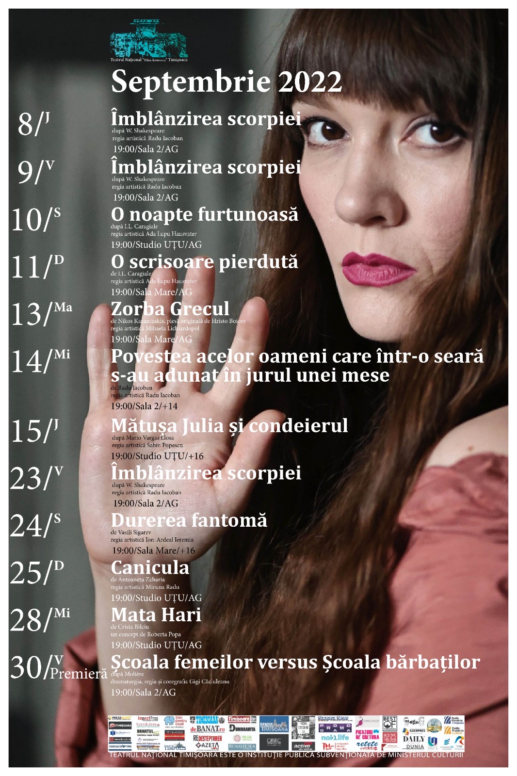 Pentru public, stagiunea se deschide joi, 8 septembrie, la ora 19:00, la Sala 2 TNTm, cu cea mai recentă premieră a sa, un spectacol incitant, de atitudine, redând textului lui Shakesparedimensiunea critică și comentariul răsturnat privind imaginea femeii ca marfă, ascunse în spatele termenului „comedie” cu care această piesă a fost etichetată de-a lungul timpului: ÎMBLÂNZIREA SCORPIEI, scenariu de Radu Iacoban după W. Shakespesare; o a doua reprezentație este programată vineri, 9 septembrie.