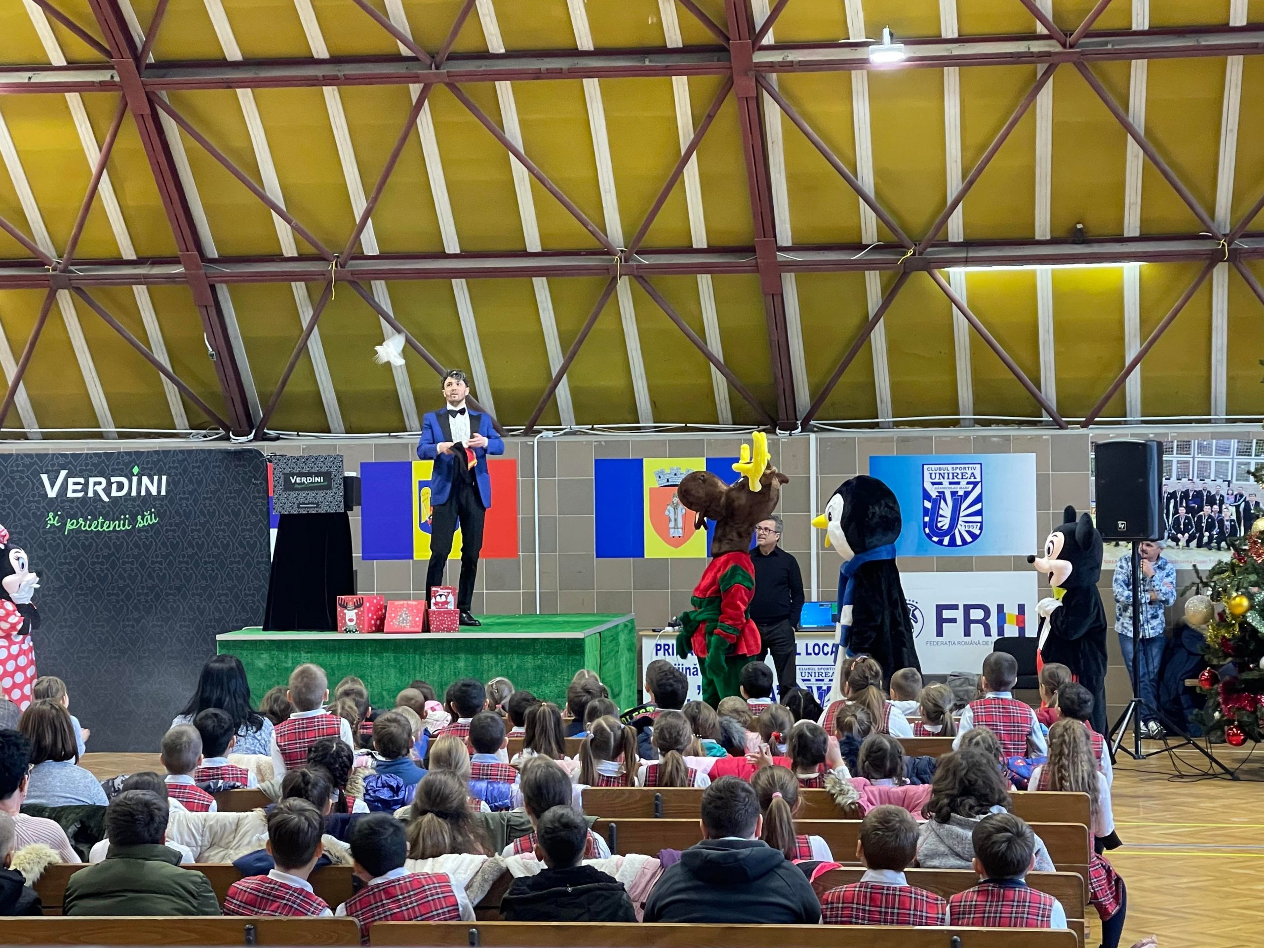 Peste o mie de copii din clasele primare și de la grădinițele din oraș și sportivii de la Clubul Unirea Sânnicolau Mare s-au bucurat miercuri de petrecerea de Crăciun de la sala de sport.