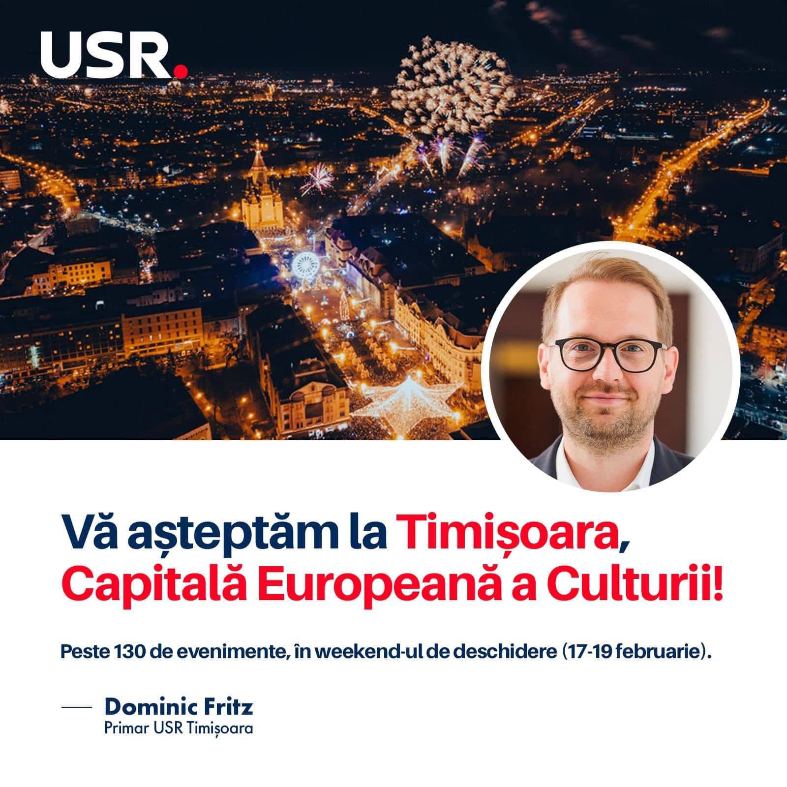 “Pe pagina de fb a USR , evident sub sigla acestui partid a apărut în urmă cu mai multe ore, un anunț al primarului Dominic Fritz prin care dumnealui îi așteaptă (nu spune dacă pe membri USR sau și pe alții) pe cititorii acelei știri la “Timișoara, Capitală Europeană a Culturii.