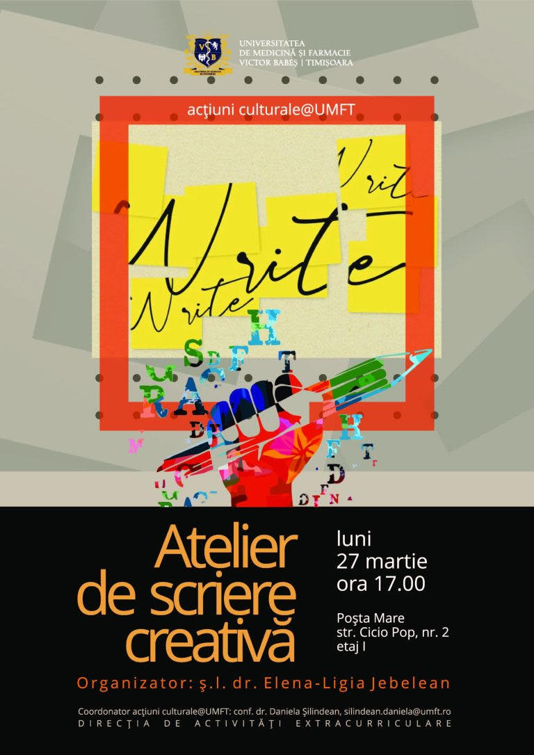 Totodată, Universitatea de Medicină și Farmacie „Victor Babeș” din Timișoara deschide o nouă componentă a programului acțiuni culturale@UMFT prin Atelierul de scriere creativă, care se va desfășura luni, 27 martie, de la ora 17.00, în clădirea Poșta Mare (strada Cicio Pop, nr. 2), etaj I.