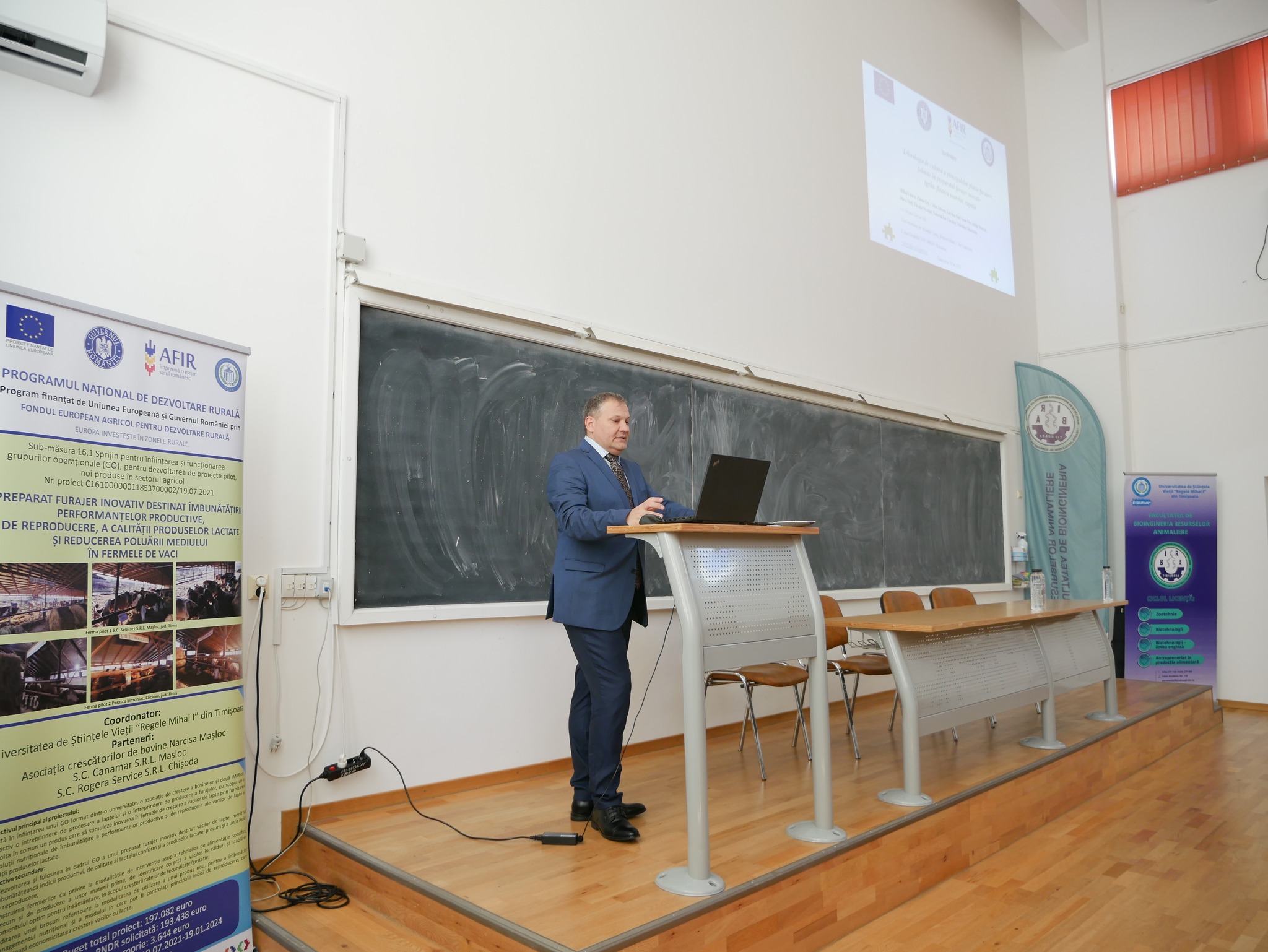 Evenimentul a avut loc pe 29 iunie. Și-a propus să disemineze rezultatele obținute în cadrul proiectului intitulat „PREPARAT FURAJER INOVATIV DESTINAT ÎMBUNĂTĂTIRII PERFORMANTELOR PRODUCTIVE, DE REPRODUCERE, A CALITĂȚII PRODUSELOR LACTATE ȘI REDUCEREA POLUĂRII MEDIULUI ÎN FERMELE DE VACI” finanțat prin Programul Național de Dezvoltare Rurală 2014-2020, Sub-măsura 16.1 Sprijin pentru înființarea și funcționarea grupurilor operaționale (GO), pentru dezvoltarea de proiecte pilot, noi produse în sectorul agricol, coordonat de Universitatea de Științele Vieții “Regele Mihai I” din Timișoara, responsabil de proiect, Prof dr. ing. Lavinia Ștef.