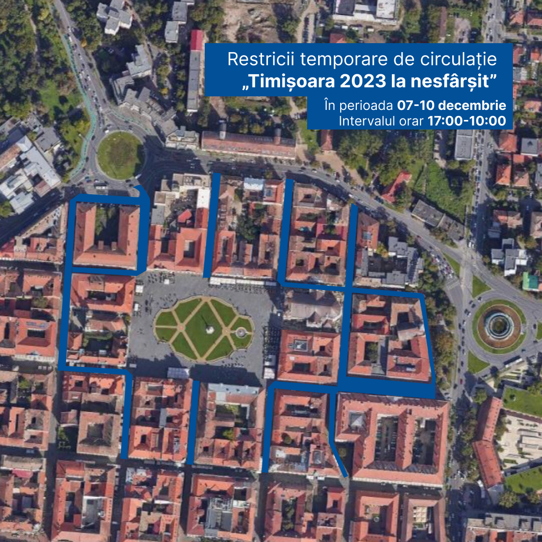 în perioada 7.12.2023 (ora 17:00) – 10.12.2023 (ora 10:00) restricționarea traficului rutier pe străzile: Palanca, George Coșbuc, Paul Chinezu, Matei Corvin, Regimentul 5 Vânători, Sergent Constantin Mușat, respectiv breteaua existentă în Piața Mărăști în spatele stației S.T.P.T., Piața Țepeș Vodă, strada General Traian Doda, Episcop Augustin Pacha, Eugeniu de Savoya, Florimund Mercy, Vasile Alecsandri, Emanoil Ungureanu, Gheorghe Lazăr (Zona Cetate) și strada General Eremia Grigorescu.
