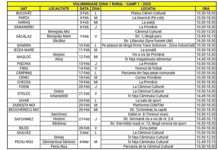 Campania a început astăzi și se va desfășura până pe 4 martie, în următoarele localități: Bucovăț, Parța, Variaș, Sânandrei, Săcălaz (și în Beregsău Mic și Beregsău Mare), Șandra, Iecea Mare, Mașloc (și în Alioș), Pișchia, Fibiș, Cărpiniș, Cenei, Checea, Foeni, Otelec (și în Iohanisfeld), Uivar, Dudeștii Noi, Becicherecu Mic, Satchinez (și în Hodoni și Bărăteaz), Biled, Giulvăz și Peciu Nou (și în Diniaș și Sânmartinul Sârbesc).