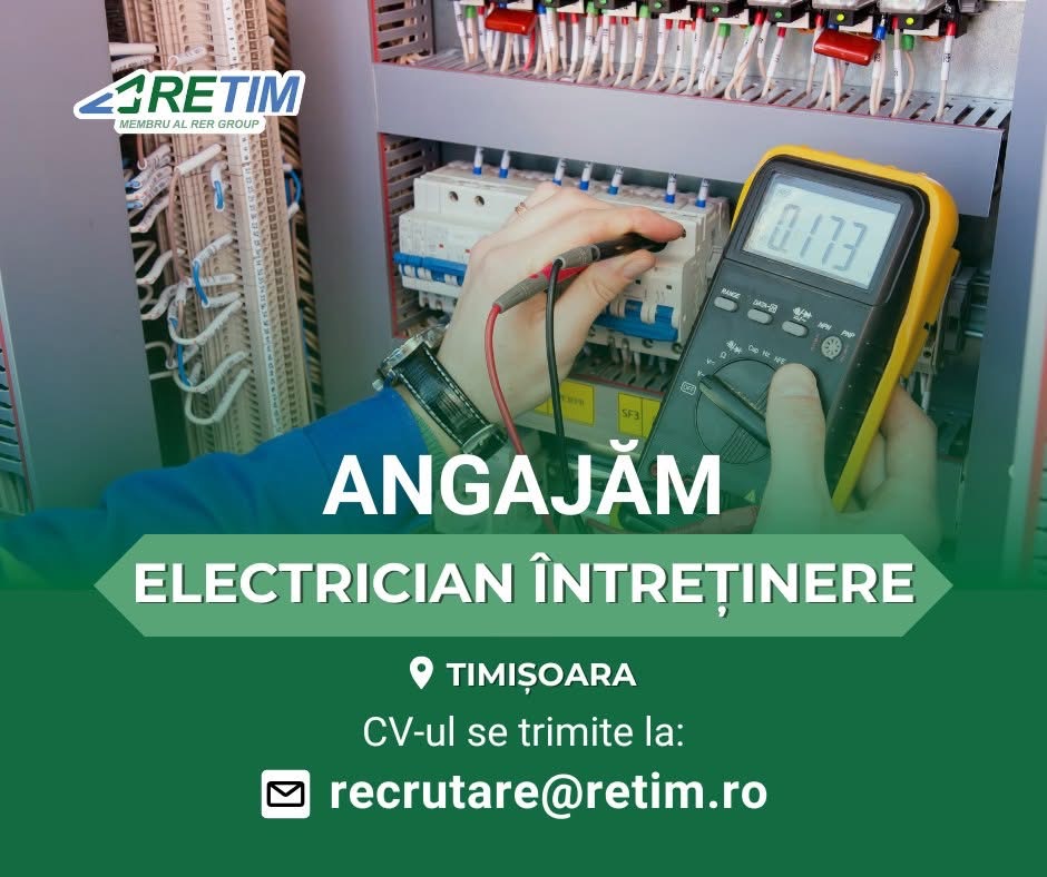 RETIM ECOLOGIC SERVICE SA, lider în colectarea selectivă a deșeurilor, recrutează ELECTRICIAN ÎNTREȚINERE pentru stația de sortare municipală din Timișoara (SSDM). Dacă ai experiență și îți dorești un loc de muncă stabil, te așteptăm să aplici!