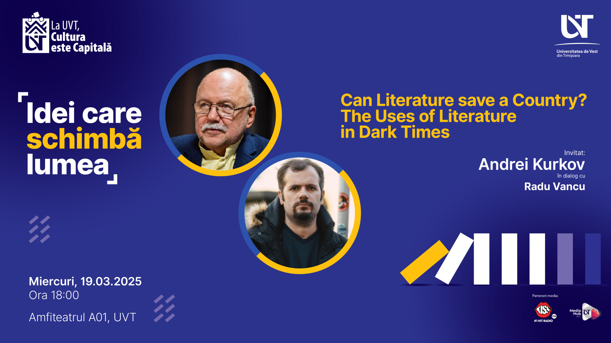 În data de 19 martie, de la ora 18:00, Universitatea de Vest din Timișoara organizează un nou dialog în cadrul seriei „Idei care schimbă lumea”. Evenimentul, intitulat „Can Literature Save a Country? The Uses of Literature in Dark Times”, îi aduce în amfiteatrul A01 pe doi dintre cei mai importanți autori contemporani: Andrei Kurkov și Radu Vancu.