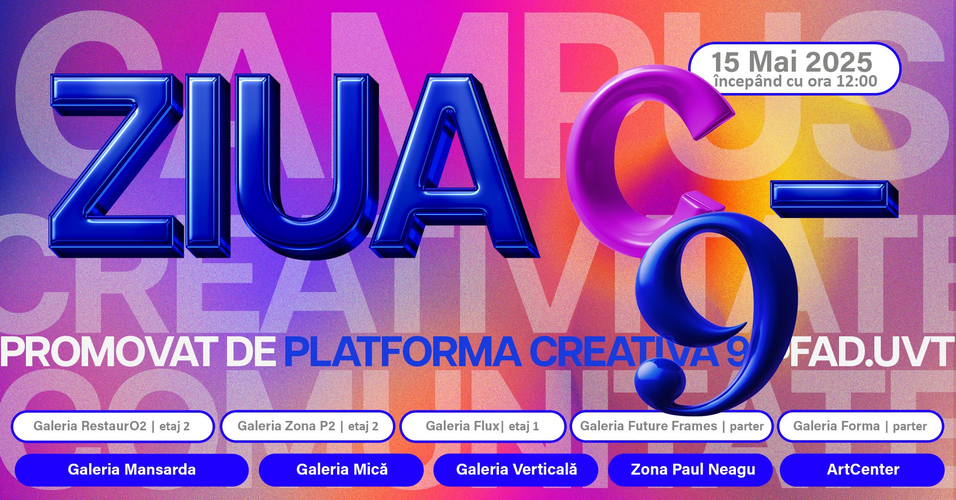 Vă invităm să participați la deschiderea oficială a Platformei Cretive 9, care va avea loc joi, 15 mai 2025, cu începere la ora 12:00, la sediul Facultății de Arte și Design (str. Oituz 4). Ne bucurăm să considerăm invitația deschisă și pentru publicul larg, pentru a cunoaște universul creativ al studenților și cadrelor didactice FAD-UVT, într-un context care celebrează expresia artistică, dialogul interdisciplinar și efervescența tinerei generații. „Facultatea de Arte și Design din cadrul UVT este una dintre cele mai dinamice instituții de învățământ superior artistic din România, recunoscută pentru abordările sale pedagogice contemporane și pentru implicarea activă în scena culturală locală și internațională. Deschiderea pentru publicul larg și pentru segmentul profesioniștilor din sfera culturală a Platformei Creative 9 este o inițiativă care demonstrează din nou rolul activ pe care universitatea noastră și Facultatea de Arte și Design și-l asumă în viața comunității”, a transmis rectorul UVT, prof.univ.dr. Marilen Gabriel Pirtea.