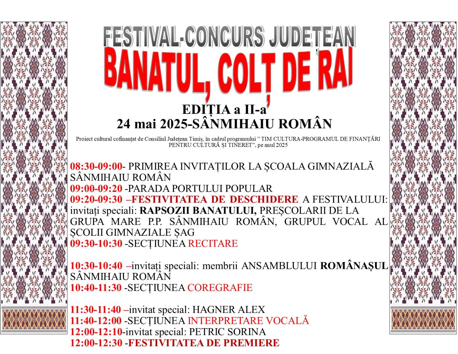 Un eveniment artistic-cultural va avea loc sâmbătă, 24 mai, în comuna Sânmihaiu Român. Este vorba despre Festivalul concurs “Banatul, colț de rai”, aflat la cea de-a doua ediție.