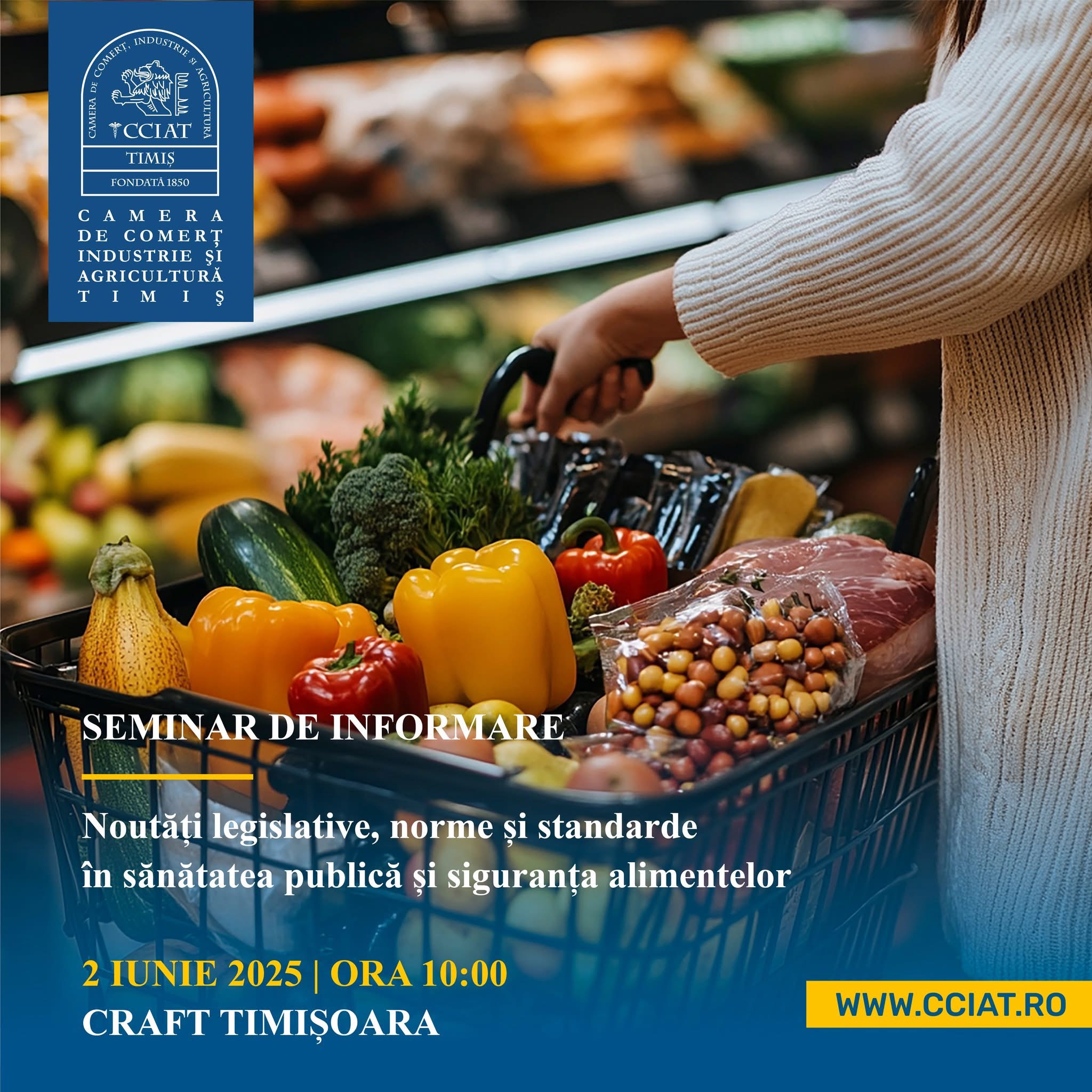 Camera de Comerț, Industrie și Agricultură Timiș, în parteneriat cu Direcția Sanitară Veterinară și pentru Siguranța Alimentelor Timiș și Direcția de Sănătate Publică Timiș, sub egida Instituției Prefectului Județul Timiș organizează un seminar de informare privind siguranța alimentelor și igiena produselor, sub genericul: Noutăți legislative, norme și standarde în sănătatea publică și siguranța alimentelor.