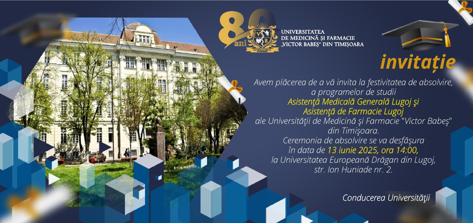 Avem deosebita onoare de a vă invita să fiți alături de noi la Festivitatea de Absolvire, un moment plin de emoție, recunoștință și bucurie, care marchează încheierea unei etape importante din parcursul nostru academic.