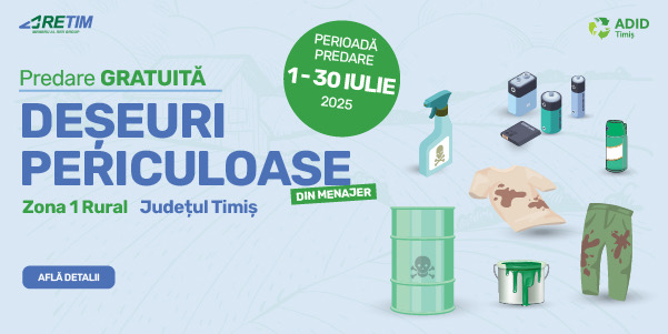 În perioada 01 – 30 iulie 2025, în Zona 1 Rural a județului Timiș, în localitățile: Șandra, Iecea Mare, Bucovăț, Parța, Mașloc (și în Alioș), Pișchia, Fibiș, Cărpiniș, Cenei, Checea, Foeni, Otelec (și în Iohanisfeld), Uivar, Dudeștii Noi, Becicherecu Mic, Satchinez (și în Hodoni și Bărăteaz), Biled, Giulvăz, Peciu Nou (și în Diniaș și Sânmartinul Sârbesc), Variaș, Sânandrei și Săcălaz (și în Beregsău Mic și Beregsău Mare), RETIM și ADID Timiș organizează o nouă campanie de predare gratuită a deșeurilor periculoase din menajer.