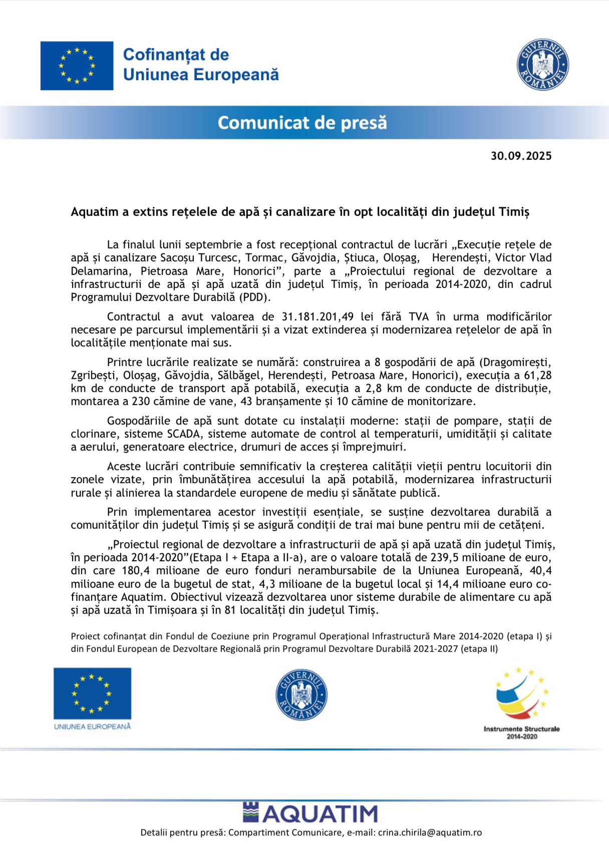 Prin implementarea acestor investiții esențiale, se susține dezvoltarea durabilă a comunităților din județul Timiș și se asigură condiții de trai mai bune pentru mii de cetățeni.