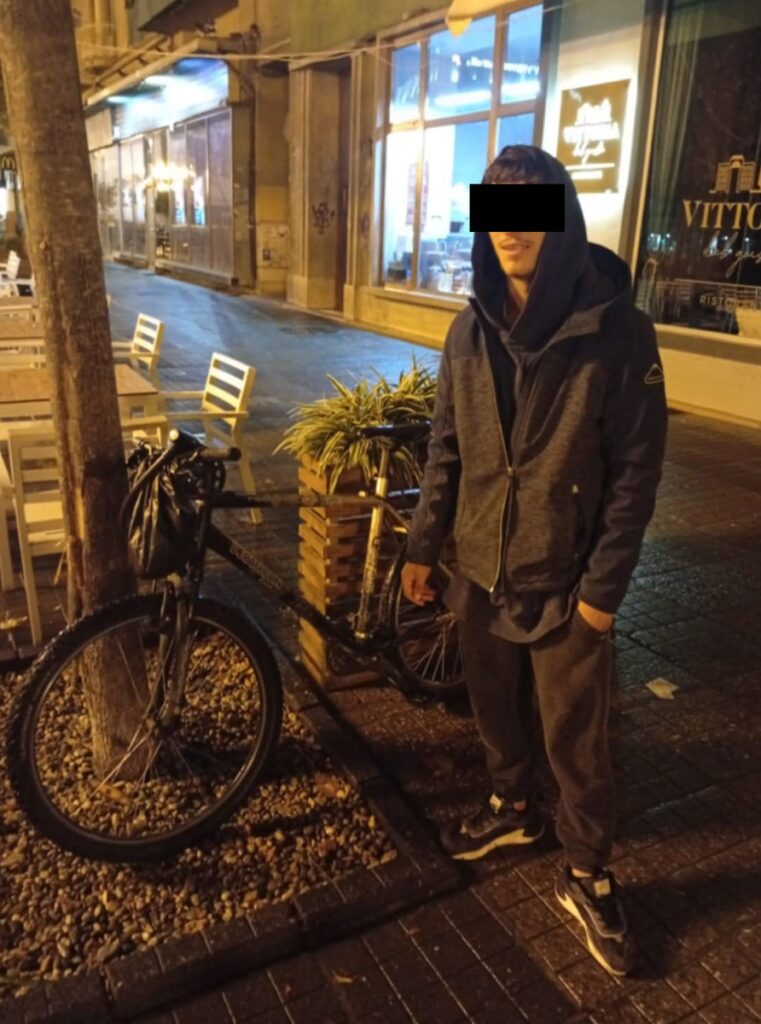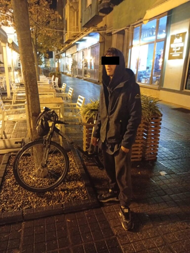 Polițiștii locali din cadrul Serviciului Siguranță și Ordine Publică, aflați în patrulare în dimineața zilei de duminică, în jurul orei 6.00, în zona centrală a orașului, au observat o persoană care a tras de sistemul de siguranță al unei biciclete legată de un pom, în fața unui restaurant din Piața Victoriei. Acesta a aruncat sistemul de prindere în coșul de gunoi pentru a scăpa și a încercat să fugă.