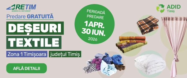 RETIM Ecologic Service S.A., în parteneriat cu ADID Timiș, anunță cea de-a doua campanie trimestrială pentru predarea gratuită a deșeurilor textile, în Zona 1 Timișoara, jud. Timiș.