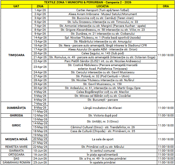 Utilizatorii casnici se pot debarasa legal și GRATUIT de deșeurile textile din gospodărie. Campania se desfășoară în perioada 01 aprilie – 30 iunie 2026, în localitățile: Timișoara, Dumbrăvița, Ghiroda, Giroc, Moșnița Nouă, Remetea Mare, Sânandrei, Șandra, Becicherecu Mic, Biled, Bucovăț, Cărpiniș, Cenei, Checea, Dudeștii Noi, Fibiș, Foeni, Giarmata, Giulvăz, Iecea Mare, Mașloc, Orțișoara, Otelec (și în Iohanisfeld), Parța, Peciu Nou, Pișchia, Săcălaz, Șag, Sânmihaiu Român, Satchinez, Uivar și Variaș.
