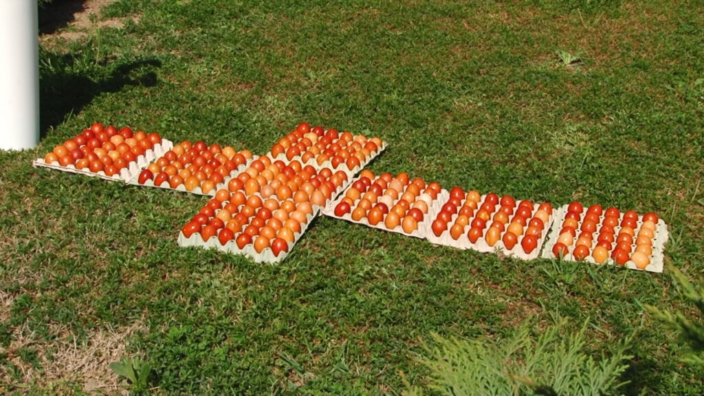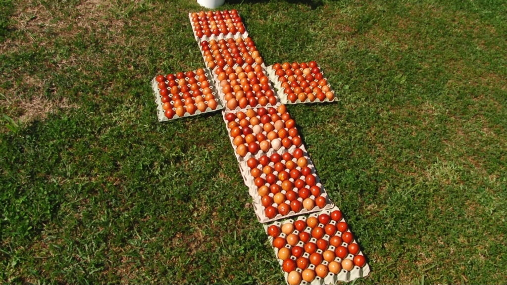 Maicile împreună cu multe ajutoare, familii apropiate mănăstirii împreună cu copiii lor, au ajutat la pregăirea celor 1000 de ouă, pe care le-au vopsit, după o tradiție străbună care se regăsește în monahismul și satul românesc; ouăle au fost vopsite printr-o metodă naturală, folosindu-se coji de ceapă roșie. După vopsire, ouăle au fost unse cu untură, pentru a li se oferi luciu, apoi au fost așezate în cofraje și depuse pe iarbă în formă de cruce, alături de icoana Răstignirii.