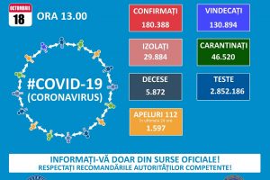 Până astăzi, 18 octombrie, pe teritoriul României, au fost confirmate 180.388 de cazuri de persoane infectate cu noul coronavirus (COVID – 19). 130.894 de pacienți au fost declarați vindecați. În urma testelor efectuate la nivel național, față de ultima raportare, au fost înregistrate 3.920 cazuri noi de persoane infectate cu […]