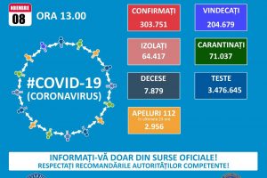 Până astăzi, 8 noiembrie, pe teritoriul României, au fost confirmate 303.751 de cazuri de persoane infectate cu noul coronavirus (COVID – 19). 204.679 de pacienți au fost declarați vindecați. În urma testelor efectuate la nivel național, față de ultima raportare, au fost înregistrate 6.752 cazuri noi de persoane infectate cu […]